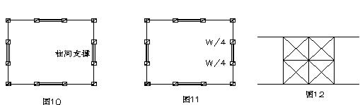 平行墻面的支座設(shè)定不動(dòng),這樣水平力如何分配到各支座算不清,只好與柱子整體計(jì)算,而一般30-40m的網(wǎng)殼,受力不大,算不清就算了,可以當(dāng)不動(dòng)支座。跨度大、力大,最好是在二側(cè)柱間支撐取2個(gè)支座不動(dòng),其他支座均假定可動(dòng),這一方面對(duì)釋放溫度力有利,更主要的是不動(dòng)支座處力很明確,就是W/4(圖11),為果柱間支撐是二跨這樣算又不準(zhǔn)了,因?yàn)榱?huì)集中在前面柱間支撐不符合實(shí)際情況(圖12)。當(dāng)水平力很大時(shí),一般就將柱間支撐斜桿直接焊到下弦球上,這樣避免了支座受彎。這時(shí)如果其他支座沿墻是不動(dòng)的,則要注意從構(gòu)造上、下部結(jié)構(gòu)柱子間還應(yīng)加連梁,否則柱頭平面內(nèi)就不穩(wěn)定了。當(dāng)支座采用球,二邊加斜撐撐到圈梁上也能避免支座受彎,但要進(jìn)行驗(yàn)算。