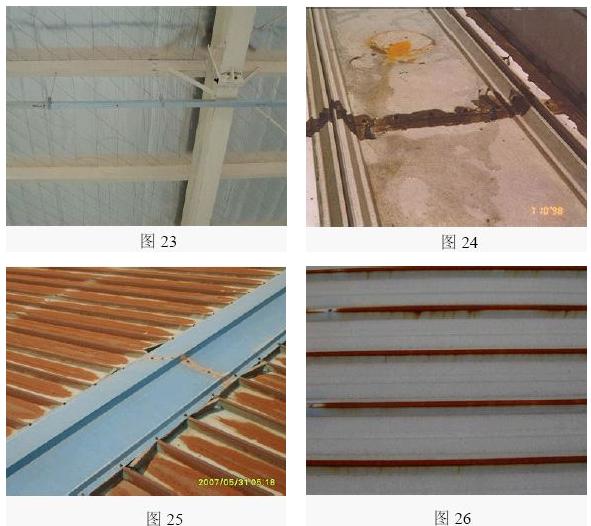 為屋面不銹鋼絲不合格,在工程完工后一個月內便出現了大面積的斷裂。圖24~26 為彩鋼板涂層不合格,在不到三年的時間內便出現了整體掉色、銹蝕現象。