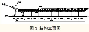 會(huì)展中心由九個(gè)主展館、八個(gè)連接體和正面一個(gè)環(huán)形大雨蓬(懸挑27m)組成半圓形輻射狀的建筑群(見圖2),主展館每個(gè)單體平面呈腰鼓形,總建筑面積達(dá)13萬平方米,從功能上看,每個(gè)展廳既可以單獨(dú)使用又可以通過連接體一起使用,能滿足各類規(guī)模的展覽。