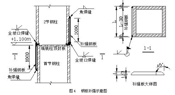 該糾偏方法采用鋼板補(bǔ)強(qiáng)和焊縫過渡相結(jié)和的方法,即:+1.1米以上的鋼柱以控制網(wǎng)軸線定位一次性安裝到位,安裝后對(duì)其與+1.1米以下的鋼柱的端頭形成的錯(cuò)口先進(jìn)行焊接,檢驗(yàn)合格后,然后用補(bǔ)強(qiáng)鋼板或焊縫進(jìn)行過渡,使其形成較好的受力傳遞。因此對(duì)錯(cuò)口值>8mm的,采用鋼板進(jìn)行補(bǔ)強(qiáng),對(duì)錯(cuò)口值≤8mm,采用焊縫過渡法使其形成平緩過渡。具體實(shí)施如下: