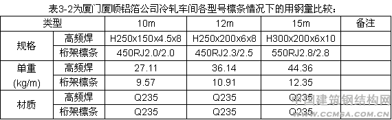 從以上兩組數(shù)據(jù)可以看出,歐本檁條在兼作系桿后,在同等受力情況下,兼作檁條與系桿雙重功能后,歐本檁條的重量仍然比單純的系桿輕(相比H型鋼檁條與系桿重量之和,甚至比單純系桿的重量還要輕);其經(jīng)濟(jì)性能不言而喻。