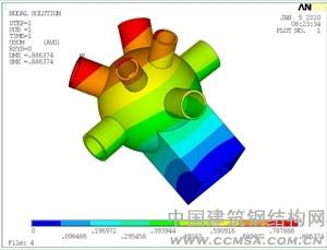 該鑄鋼件節(jié)點(diǎn)最大位移為3.923mm,節(jié)點(diǎn)大部分應(yīng)力均小于200N/?2,局部區(qū)域出現(xiàn)應(yīng)力集中,應(yīng)力云圖符合客觀規(guī)律,鑄鋼節(jié)點(diǎn)應(yīng)力分布均勻,強(qiáng)度和剛度能夠滿足設(shè)計(jì)要求。
