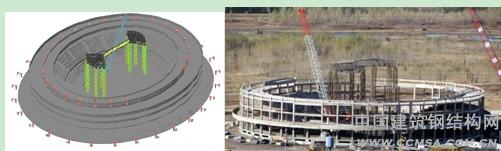 圖9 興安盟體育館臨時(shí)支撐、扇形桁架構(gòu)件和橫梁安裝