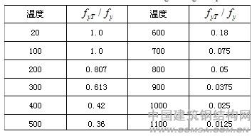對普通結(jié)構(gòu)鋼而言,其屈服強度隨溫度的上升而降低。在溫度達到300 時,材料已無明顯的屈服平臺。因此,研究者通常采用鋼材的名義屈服強度來代替真實屈服強度。為使結(jié)構(gòu)有足夠的安全儲備,作者將材料的比例極限強度定義為鋼材高溫下的屈服強度。鋼材的高溫強度降低系數(shù)在表3中列出。