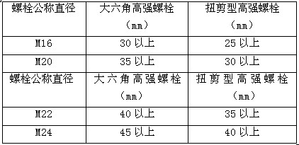 考慮到鋼構(gòu)件加工時采用鋼板一般均為正公差,有時材料代用也多是以厚代薄,所以連接總厚度增加3~4mm現(xiàn)場較多,大六角高強螺栓長度為螺頭下支承面至螺尾的長度, 選用螺栓長度應(yīng)為被緊固連接板束的厚度加一個螺母和兩個墊圈的厚度,扭剪型高強螺栓的長度為螺頭下支承面至螺尾切口處的長度,選用螺栓長度應(yīng)為被緊固連接板束的厚度加一個螺母和一個墊圈的厚度,具體一般螺栓長度為連接板厚再加下表增加長度并取5mm的整倍數(shù)。
