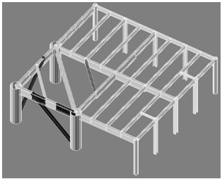 “十”字形鋼偏心支撐筒由12根鋼管混凝土柱及鋼偏心支撐組成(詳圖3),在單斜偏心支撐與柱的間隔處,恰可以作為建筑開(kāi)門(mén)之用,為滿足建筑交通功能,結(jié)構(gòu)偏心支撐布置呈不同方向布置(傾斜);而八字形偏心支撐也能滿足建筑外觀立面的美學(xué)訴求(詳圖4),結(jié)構(gòu)體系的力學(xué)特性也基本不變。
