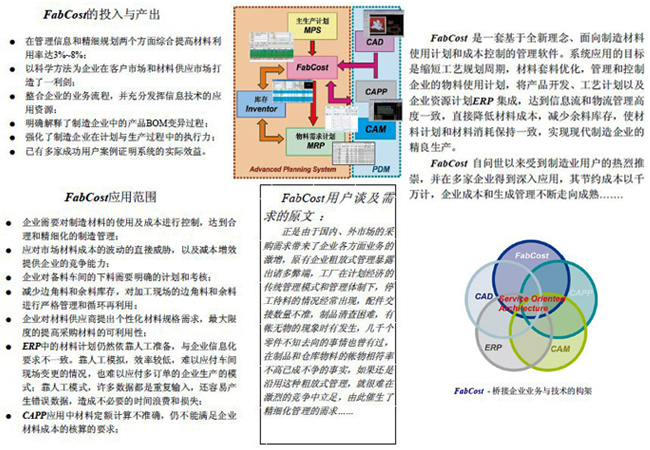 FabCost(Fabrication Cost-制造成本)軟件實施的項目目標(biāo)是從制造企業(yè)的計劃源頭,通過計算機(jī)可視化技術(shù)與數(shù)據(jù)挖掘技術(shù)的有機(jī)集成,實現(xiàn)制造材料使用精細(xì)管理和控制,從而達(dá)到減少材料成本,縮短制造規(guī)劃周期,提高工作效率和規(guī)范加工執(zhí)行水平等“減本增效”的目的。